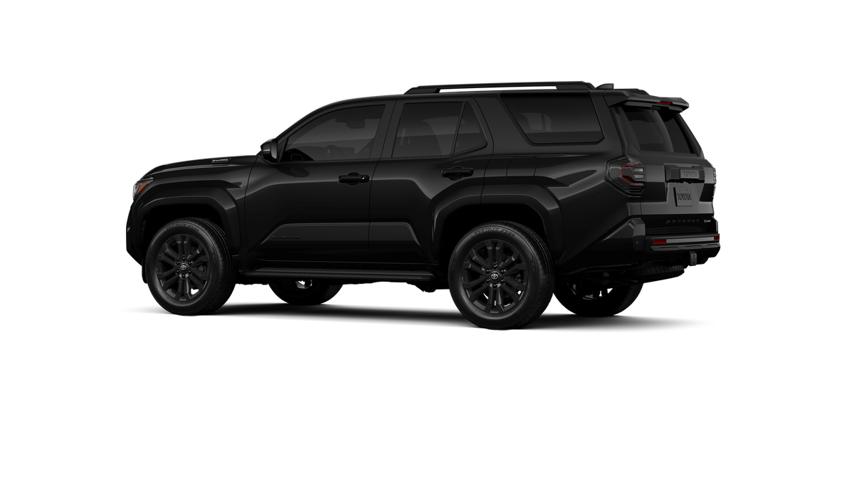 - Dark-chrome tri-bar grille; gloss-black mirror caps and door handles; color-keyed overfenders and rear spoiler; gloss-black "PLATINUM" and "4RUNNER" badges