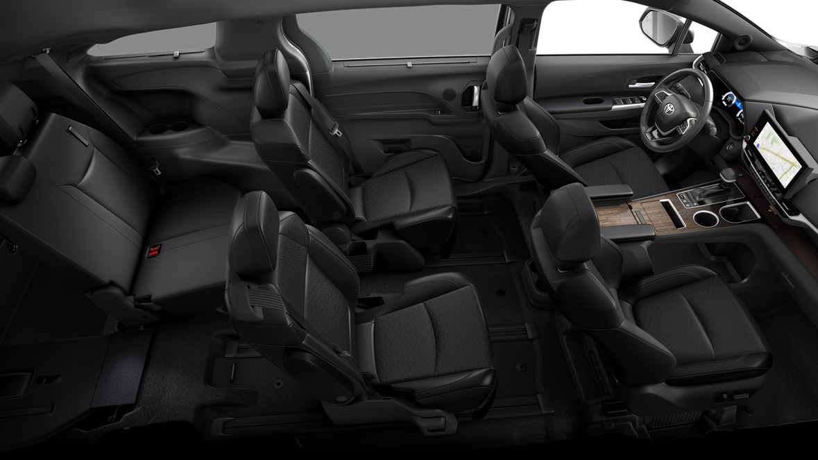 - 7-passenger seating with premium leather-trimmed second-row-seat captain's chairs with super-long-slide feature and ottomans