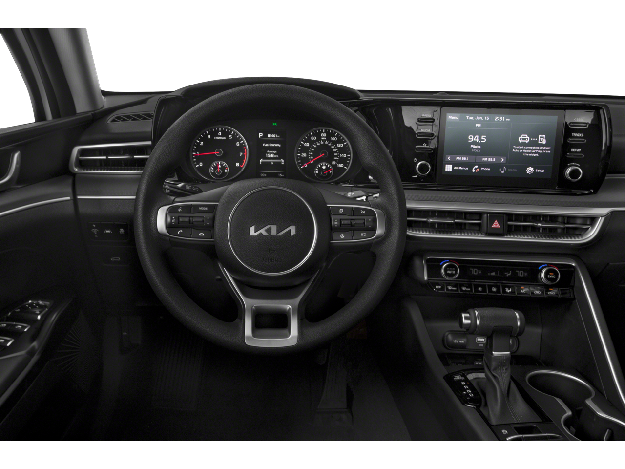 The K5's striking exterior design commands attention with its sleek lines and bold front grille. Slip inside the spacious cabin and you'll be surrounded by premium materials and thoughtful technology, including a large touchscreen display with seamless smartphone integration via Apple CarPlay and Android Auto.
